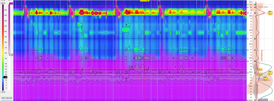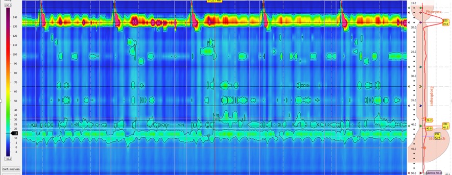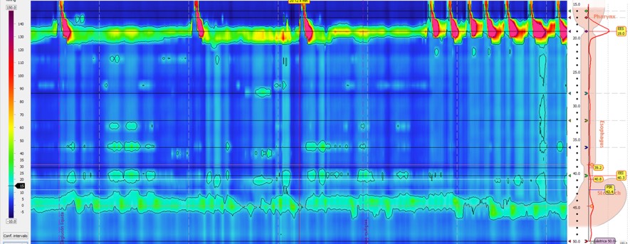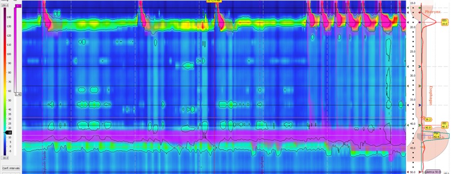 En la manometría con impedanciometría la unión gastroesofágica tiene morfología de hernia de hiato con alteración de la relajación y aperistalsis del cuerpo esofágico. En la impedanciometría se observa retención del bolo líquido en decúbito alcanzando una columna de retención de unos 4 cm.