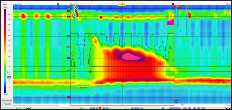 Unión esofagogástrica (UEG): tipo IIIa en relación con hernia de hiato de 4 cm. Presión en reposo aumentada (presión basal media 56,4 mmHg), con relajación incompleta de la UEG con las degluciones a expensas de la crura diafragmática en decúbito supino (IRP mediana 55,7 mmHg) y en sedestación (IRP mediana 44,7 mmHg). Presencia de presurización compartimentalizada entre el esfínter esofágico inferior (EEI) y la crura diafragmática, sin poder descartar que la banda hiperpresiva distal al EEI pudiera corresponder al efecto compresivo de la banda gástrica. Cuerpo esofágico: Se identifican un 10% de ondas peristálticas normales, 50% ineficaces y 40% hipercontráctiles en decúbito supino y en sedestación 40% de ondas normales, 20% fallidas y 40% hipercontráctiles (figura 3).