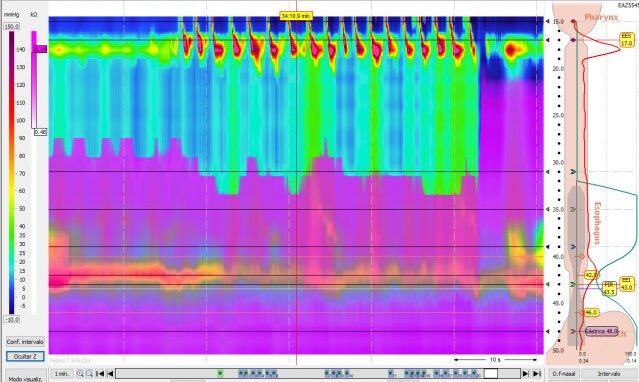 En el test de sobrecarga con 200 ml de agua (test de deglución rápida): se identificó una relajación incompleta de la UEG con presurización panesofágica breve compatible con patrón hiperpresivo breve. Durante el test la paciente se encontró sintomática (regurgitación líquida) (figuras 4).
