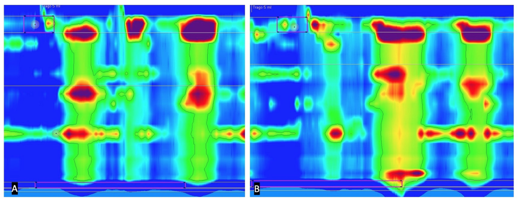 Figura 3. Manometría esofágica. Sonda bucleada en tercio distal esofágico. Ondas fallidas en la segunda (A) y en la décima (B) deglución con presurización panesofágica tras cada una de ellas.
