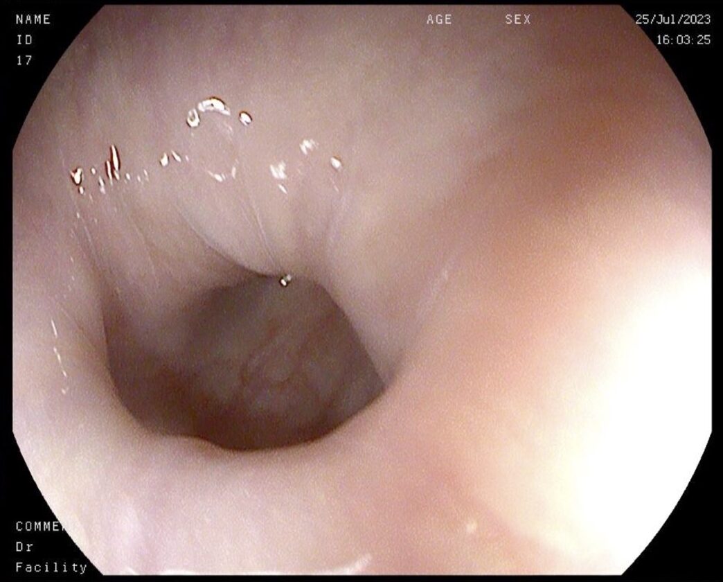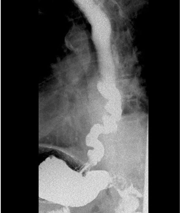 Varón de 84 años, con antecedentes de hipertensión arterial, dislipemia, cardiopatía isquémica crónica, carcinoma de próstata tratado con radioterapia, en remisión desde 2013, y síndrome de aceite tóxico por intoxicación con aceite de colza en 1981. Es derivado a nuestras consultas por disfagia para sólidos y líquidos de unos 30 años de evolución, que ha empeorado en los últimos 5 años, con episodios de impactaciones que se resuelven con la ingesta de agua. Asocia regurgitaciones líquidas y, de forma puntual, dolor torácico. El paciente relaciona el inicio de los síntomas con la intoxicación por aceite de colza. En la endoscopia digestiva alta se visualiza un esófago con mucosa de aspecto normal con morfología de sacacorchos (figura 1), con ondas terciarias no propulsivas y con cierta resistencia al paso del endoscopio a través de la unión esofagogástrica (UEG). Se toman biopsias esofágicas que no presentan alteraciones. [caption id="attachment_6748" align="alignnone" width="1044"]