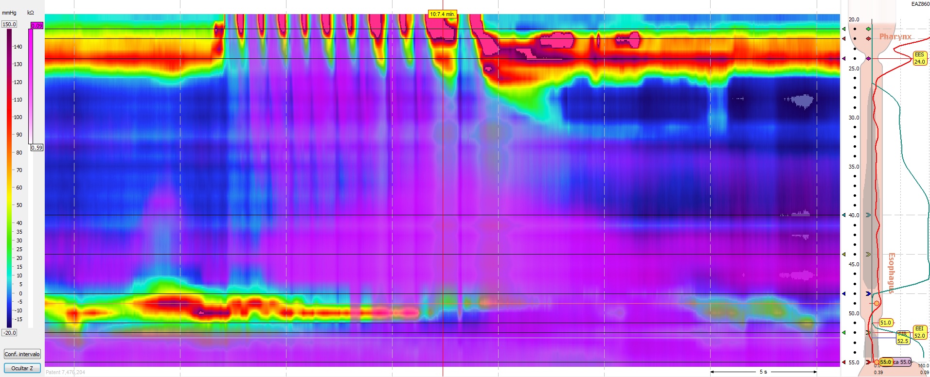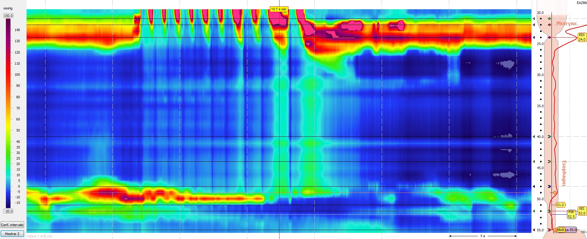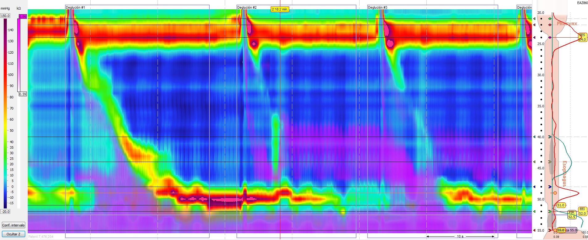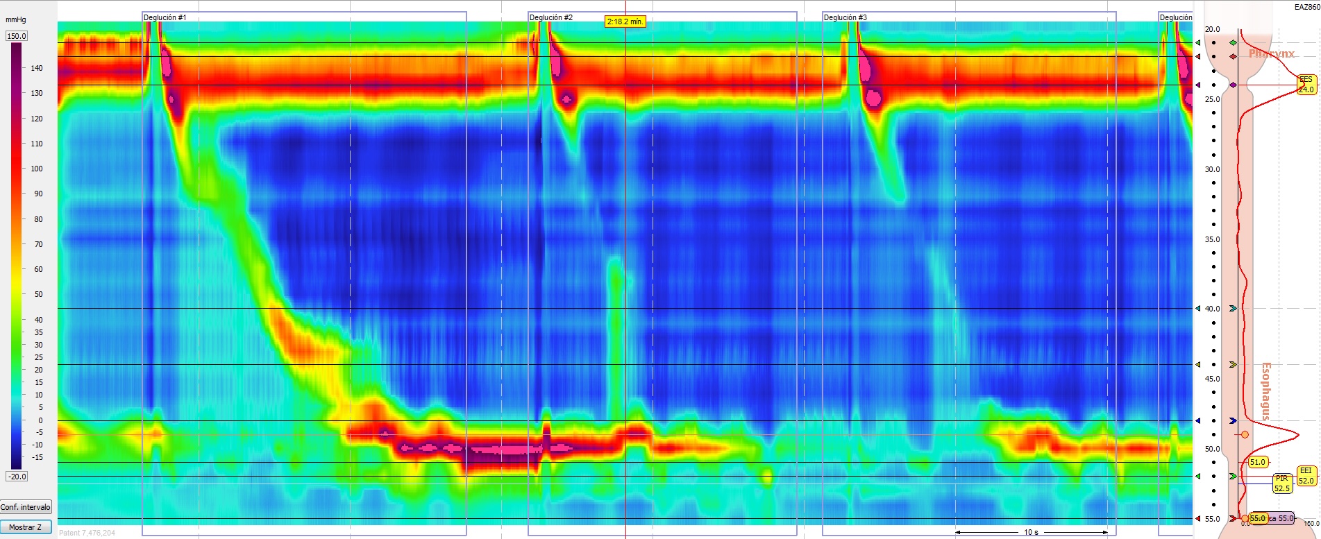 Se realiza nueva endoscopia digestiva alta que es normal. Tras descartar complicaciones de su ERGE, se solicita manometría esofágica con impedanciometría. En esta se aprecia una peristalsis ineficaz con mala reserva contráctil esofágica; pero lo que llama la atención es la presencia de relajaciones tardías del esfínter esofágico inferior (EII) (figura 1) que generan, cuando se presentan, una clara retención del bolo a nivel esofágico (figura 2), siendo esto más evidente durante el test de degluciones múltiples en el que vemos de forma manifiesta esta alteración motora del EEI (figura 3 y 4). Sin embargo, al ser este hallazgo intermitente, cuando calculamos el IRP medio de las 10 degluciones es de 10.5 mmHg/4s, por lo que no reúne todos los criterios de obstrucción al flujo en la unión esófago-gástrica según Chicago v 4.0, pero en cualquier caso es más que evidente que esta es la causa más probable de su disfagia y que la causa son los opiáceos.